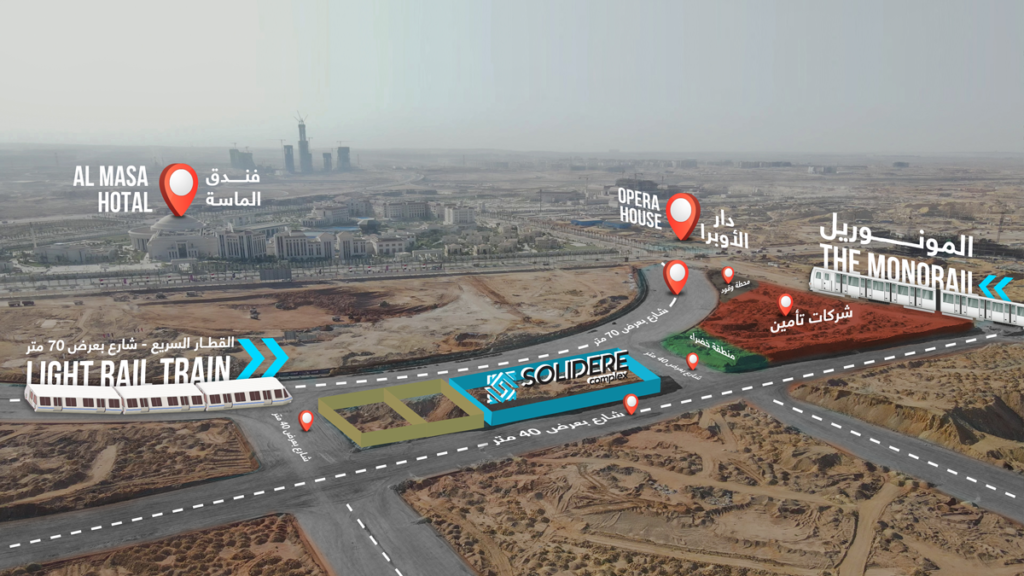 SOLEDEERE Complex is located in the heart of new capital downtown facing directly the light rail train, El Masa hotel and The Opera. Solidere surrounded by 3 streets 70m, 40m, 40m and Insurance companies, petroleum, fashion and gold dealers.